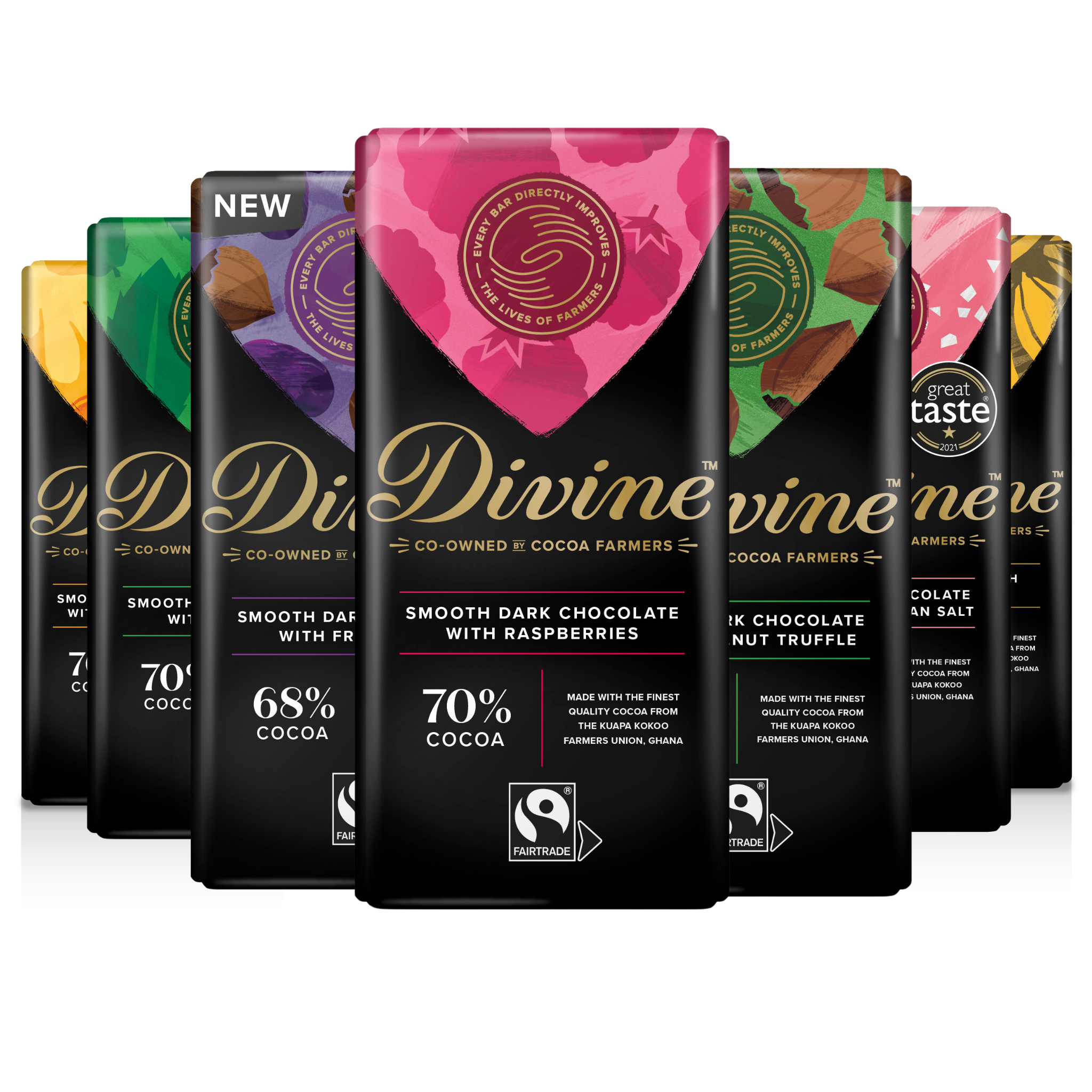 For those who delight in the bittersweet indulgence of dark chocolate, then the Dark Chocolate Lover’s Bundle is the perfect gift. Containing seven of the finest dark chocolates from the Divine range to indulge in, this gift boasts flavours ranging from tangy raspberry to warming ginger and orange, fresh revitalising mint or sophisticated salty smoothness. Each flavour boast a rich, yet mellow cocoa flavour and a smoothness unusual for such high cocoa content.